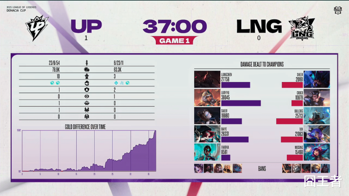 结果第一局比赛,被UP打成了“冗长”的碾压局。比赛第3分钟左右,Croco赵信抓下,被UP双人组抓住机会反杀,UP拿下一血;比赛第19分钟左右,爆发先锋团,UP打出1换3;比赛第23分钟左右,爆发小龙团,UP大获全胜打出0换4;最终比赛第37分整,UP团灭LNG,然后一波结束比赛。